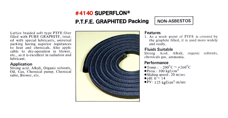 รายละเอียด : Lattice braided soft type PTFE fiber filled with PURE GRAPHITE, treated with special lubricants, universal packing having superior registances to heat and chemicals. Also applicable to dry-operation in blower, etc., as it is excellent in rediation and lubricant.